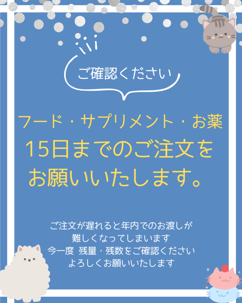 年末のフード、お薬、サプリメントは15日までにご注文くださいますようお願いいたします。