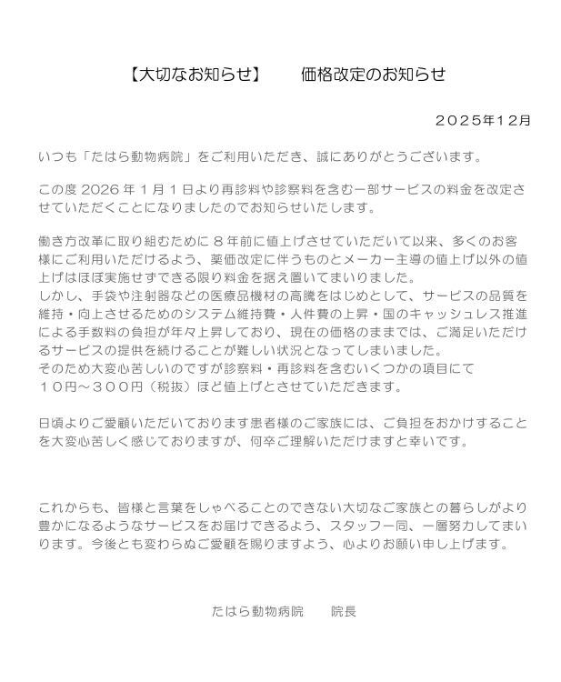 新患の受け入れは診察受付終了の60分前(午前は10時30分、午後は17時、木曜の午後は16時)までとなり、それ以降は申し訳ありませんが時間外対応とさせていただきます。