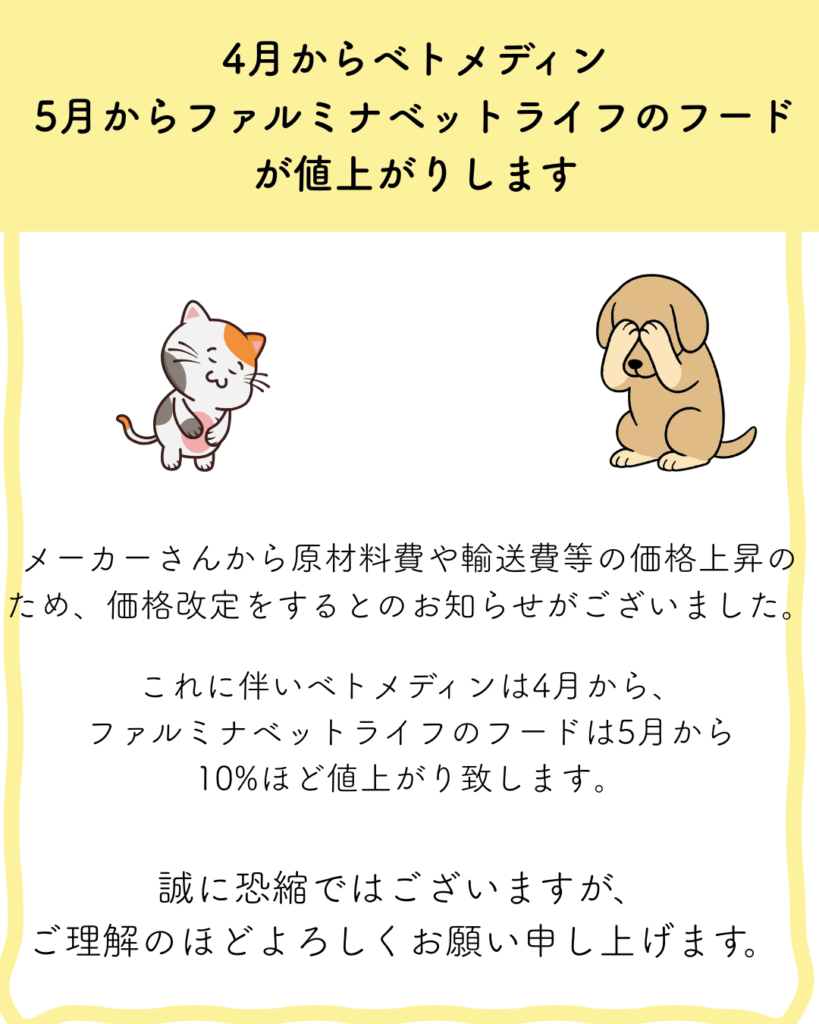 5月からはファルミナベットライフのフードが10%程の価格改定をさせて頂きます。