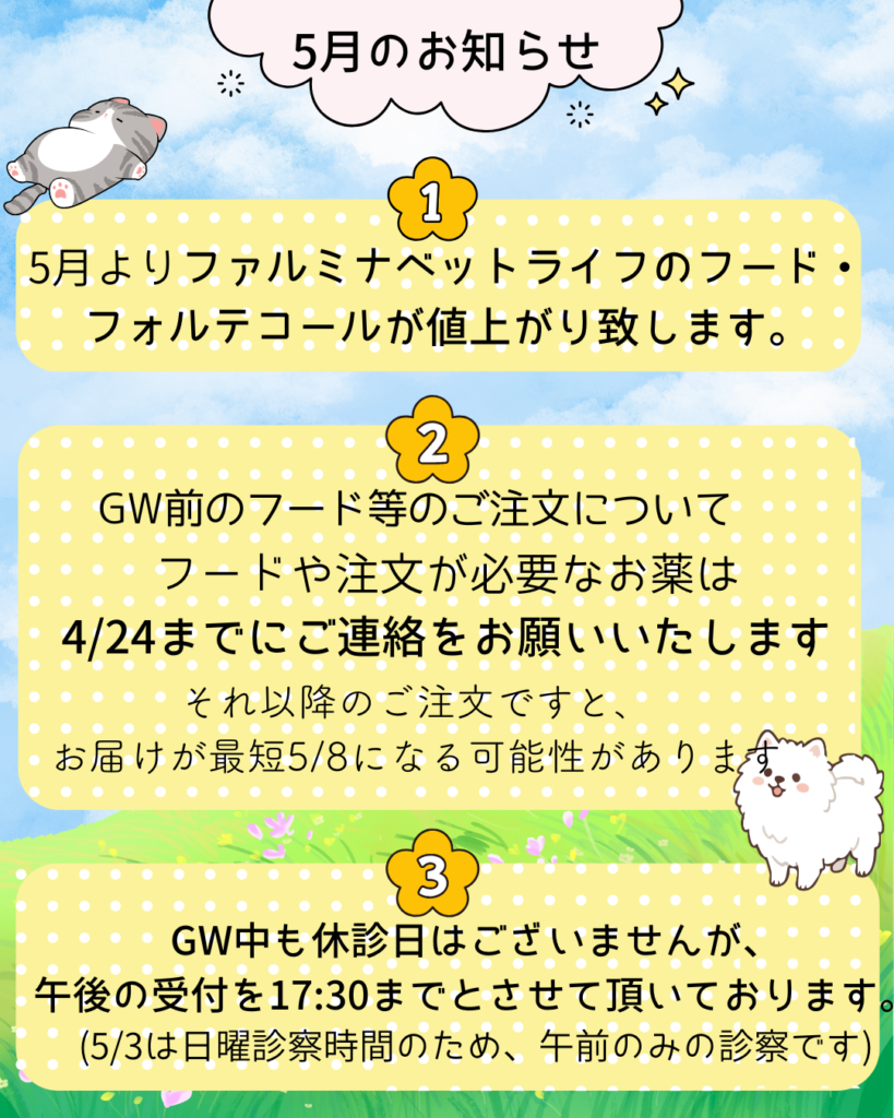 新患の受け入れは診察受付終了の60分前(午前は10時30分、午後は17時、木曜の午後は16時)までとなり、それ以降は申し訳ありませんが時間外対応とさせていただきます。